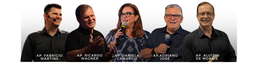 Estarão conosco, convidados especiais, para compartilharem a palavra da fé neste Congresso, e, juntos, assegurarmos o que Deus tem para nós. Os preletores convidados serão: Apóstolo Fabrício Martins, Apóstolo Ricardo Wagner e Apóstolo Aluízio de Morais.