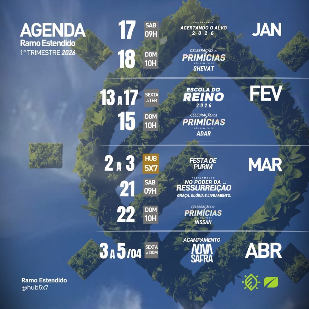 Estamos disponibilizando para todos a nossa agenda do primeiro trimestre de 2026, para que você possa se programar e estar conosco no ano de 2026, presencialmente, e conhecer todo o movimento aqui no Hub 5X7, em comunhão com irmãos e irmãs, ou online, sempre reservando e priorizando a palavra do Senhor.